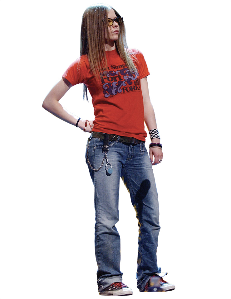 티셔츠와 청바지는 평범한 스타일의 대표 공식이지만 에이브릴 라빈이 입으면 다르다. 빈티지 벨트와 체인 장식, 큼직한 안경에 주목할 것.
