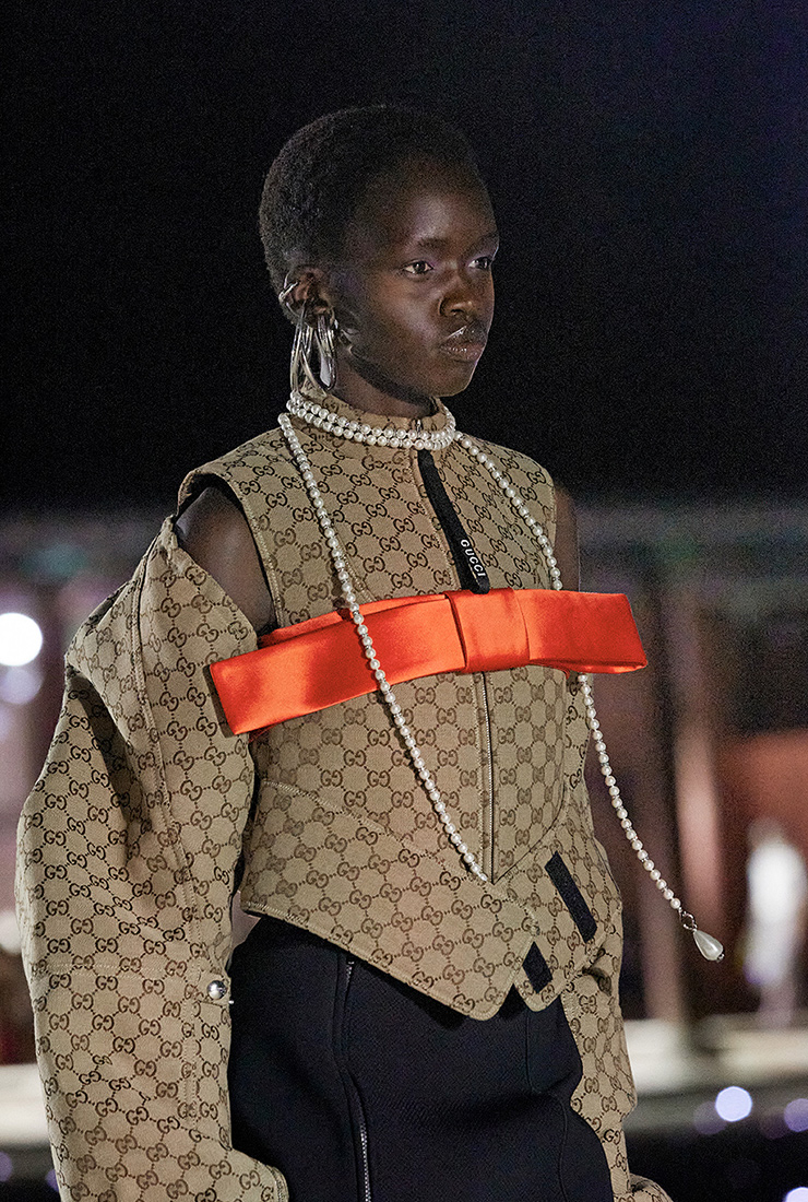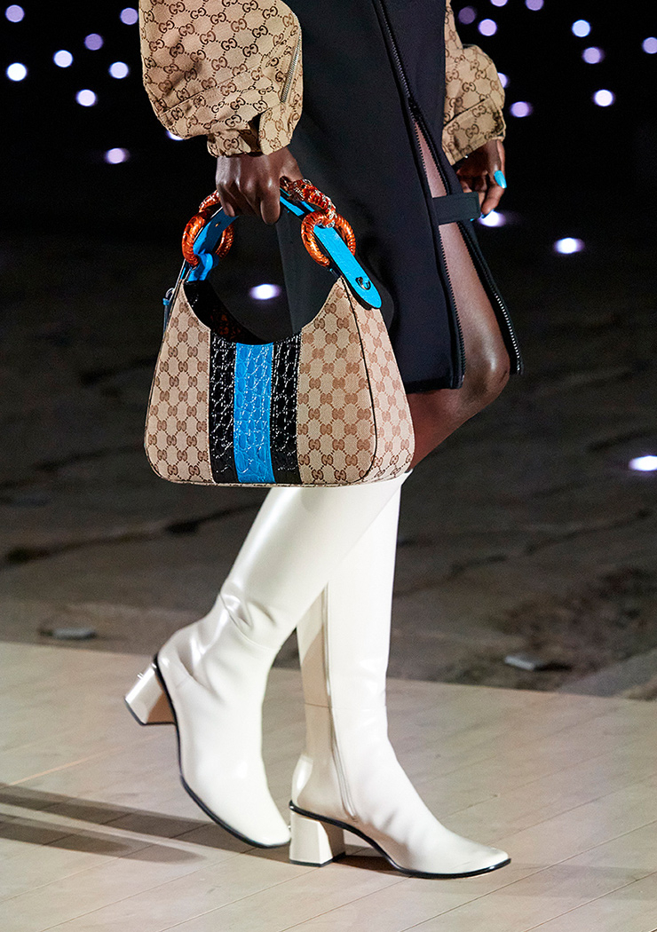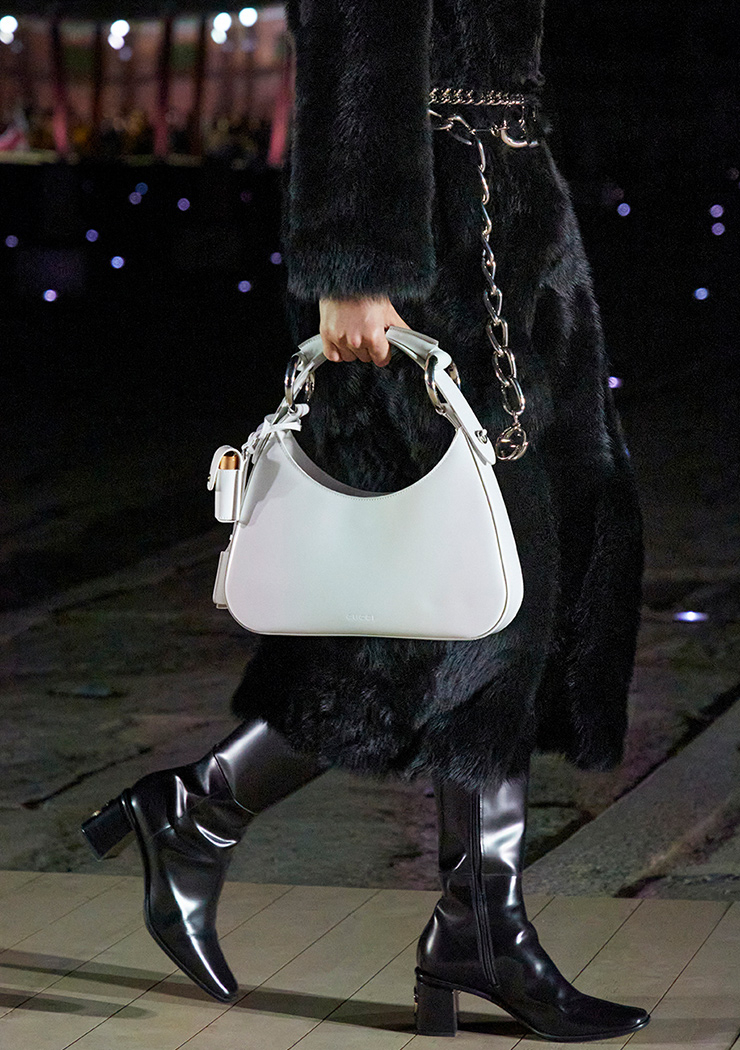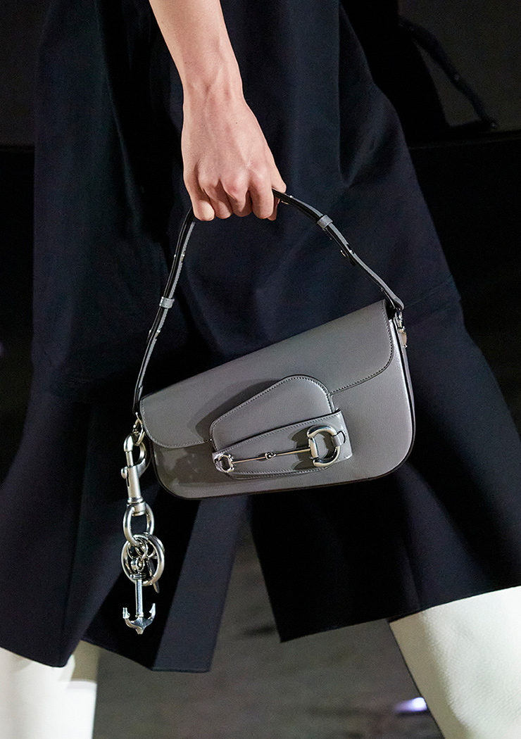 구찌의 아이코닉 디테일을 재해석한 핸드백 라인에도 강렬한 개성이 더해졌다. 레더 구찌 홀스빗 체인 백은 보다 슬림한 형태로 선보였다. 홀스빗 디테일을 더한 디보싱 레더의 남성용 가방도 눈길을 끌었다. 구찌 아카이브의 심플한 매력이 돋보이는 구찌 백은 화려한 스쿠버 컬러와 장식적 요소를 통해 재해석됐다. 지난 시즌 처음 선보인 라운드 형태의 마름모꼴 디자인 트래퍼조이드 홀스백 체인 백은 이리디센트와 프레셔스 레더로 재탄생했다.