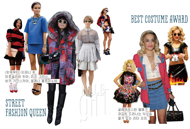 각자의 스타일대로 패션을 즐기는 5명의 ‘러시안 팩’(미로슬라바 두마, 안야 지오우로바, 비카 가진스카야, 울리아나 세르젠코, 엘레나 페르미노바)가 스트리트 패션계의 신흥 강자로 떠올랐다. 이에 대적하는 또 다른 패션 군단은 컬러 매치의 귀재로 떠오른 <엘르 차이나> 에디터 리프 그리너, 검은 단발머리의 홍콩 멀티숍 레인 크로포드 바이어 티파니 휴, 중국계 영국인 파워 블로거 수지 라우로 구성된 ‘대륙의 패션왕’들. 베스트 코스튬상 레이디 가가의 기상천외한 크레이지 패션이 그리운 요즘, 그녀의 빈자리를 채워줄 아이콘이 나타났다. ‘제 2의 리한나’라 불리는 영국 출신의 가수 리타 오라가 바로 그 주인공. 2012년 혜성처럼 나타나  세계를 뒤흔들고 있는 그녀는 런던 골목의 바에서 노래하다 발탁되어 일약 스타덤에 올랐다. 한여름에도 털 코트를 입고 다닐 정도로 패션관이 확고한 로타는 영국 특유의 스트리트 감성을 적절하게 믹스해 펑키하고 개성 강한 스타일로 베스트 코스튬상을 수상했다.