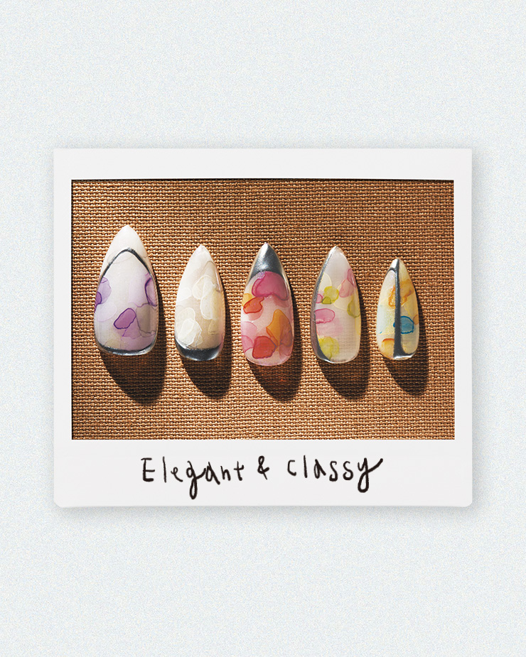 프렌치는 가을 하면 빼놓을 수 없는 디자인이죠. 올가을엔 실버 컬러의 네일 라이너를 활용해 손톱마다 각기 다른 느낌의 프렌치를 그려보는 걸 추천해요. 여기에 가을과 잘 어울리는 수채화 컬러를 툭툭 떨어트려 연출한 ‘틴트 네일’을 접목하면 우아하고 세련되지만, 기존과 다른 프렌치를 완성할 수 있을 거예요.