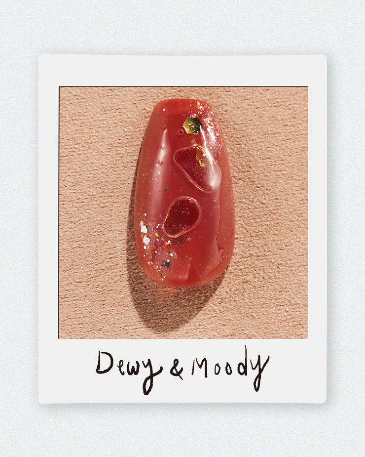 윤슬처럼 맑게 빛나는 느낌이 매력적인 ‘버블 네일’을 추천하고 싶어요. 두 개의 손톱을 메인으로 잡고, 시럽 텍스처의 버건디 네일을 꽉 채워 발라준 뒤 톱 젤을 도톰하게 올려주세요. 살짝 경화한 상태에서 주삿바늘로 기포를 넣어주면 따뜻한 차 위에 투명한 거품이 올라간 듯한 느낌을 완성할 수 있어요. 나머지 손톱은 글리터나 프렌치 네일을 연출해 심플하게 표현하면 과하지 않아요.