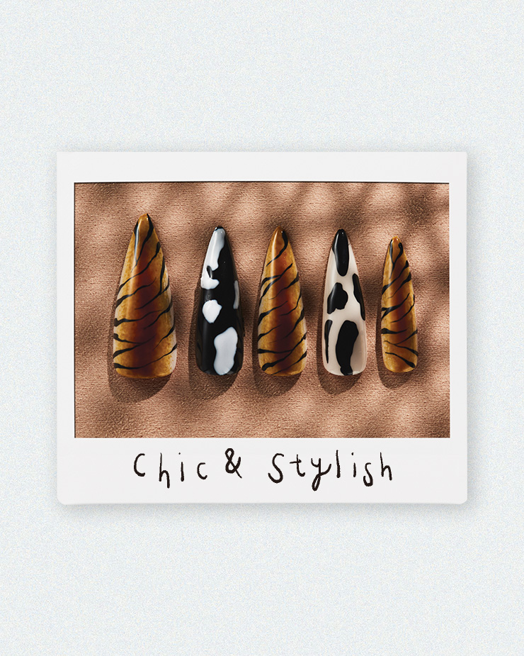 올가을에는 호피나 애니멀 패턴을 활용해 이미지 변신을 꾀하면 어떨까요? 한 가지 패턴만 사용하면 뻔하고 지루할 수 있으니 두 가지 종류의 애니멀 패턴 스티커를 믹스해 보세요. 끝으로 갈수록 뾰쪽하게 마무리되는 ‘스틸레토’ 형태로 네일 셰이프를 잡아주면 아찔한 무드가 살아난답니다.