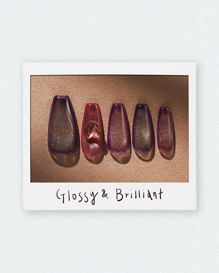 버건디와 플럼 컬러의 맑은 시럽 네일로 손톱 사이드에 테두리를 그린 뒤, 핑크빛 자석 젤을 중앙부터 테두리 경계까지 그러데이션하듯 발라 보세요. 심플한 게 싫다면 오로라 하트 파츠를 포인트로 얹는 것도 좋습니다. 사이드는 사선으로 가다가 끝부분만 직선 형태로 떨어지는 발레리나 셰이프를 연출하면 고급스러운 느낌을 더할 수 있어요.
