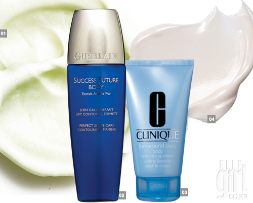 1 겐조키 프레시 프로스티 뱀부. 상큼한 셔벗 타입 크림 2 겔랑 석세스 퓨처 보디 퍼펙트 쉐이프 케어, 15만3천원. 3 크리니크 턴어라운드 보디 스무딩 크림. 각질 제거 효과의 크림. 3만9천원. 4 크리스챤 디올 캡춰 토탈 멀티 퍼펙션 리퍼밍 보디 컨센트레이트, 16만5천원.