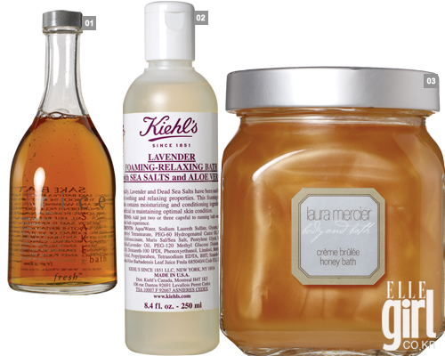 1 프레쉬 사케 배스. 달콤한 복숭하 향의 입욕제. 14만6천원. 2 키엘 라벤더 포밍 릴렉싱 배스 위드 씨 솔드 앤드 알로에 베라. 피부 진정과 긴장 완화의 효과가 있다. 3만원. 3 로라 메르시에 허니 바스 '크림 브륄레' 5만2천원. |