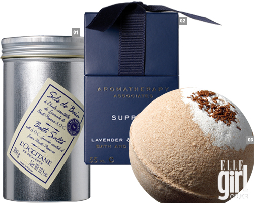 1 록시땅 라벤더 배스 솔트, 향이 진해 확실한 릴렉스 효과를 누릴 수 있는 입욕제. 3만3천원. 2 아로마 테라피 어소시에아트 딥 릴렉스 바스 & 샤워 오일. 물에 조금씩 떨어뜨려 사용할 것. 8만9천원. 3 밤 코스메틱 초콜릿 허브 배스 블라스터. 달달한 코코아 향의 입욕제. 가격 미정. |