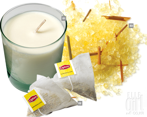 STEP 5 CANDLE&TEA * 스파를 하기 전 따뜻한 차 한잔은 필수. 입욕을 하는 동안 몸속 수분이 빠져 나가므로 빼앗길 수분을 미리 보충하는 것이 좋다. 또 몸을 따뜻하게 해 땀과 노폐물이 몸 밖으로 더 쉽게 배출되도록 하니 본격적인 홈 스파를 즐기기 전에 미리 마셔둘 것. * 캔들은 분위기를 업그레이드할 뿐 아니라 각종 아로마 테라피 효과를 덤으로 얻을 수 있다. 상큼한 시트러스 향은 활력을 주며 라벤더와 캐모마일, 일랑일랑은 스트레스 해소와 진정 효과를, 알싸한 민트 향은 머리를 맑게 해준다. 향을 즐기며 가볍게 스트레칭하면 더욱 좋다. 몸을 담그고 아랫배를 시계 방향으로 10번 정도 천천히 문지르면 하복부 순환에도 좋고 손발이 찬 증상을 개선할 수 있다는 것이 정현지 원장의 설명. 욕조에 다리를 뻗고 앉아 팔을 펴고 함께 상체를 숙이면 긴장된 다리의 근육을 이완시킬 수 있다. 릴랙싱 효과가 배가되나. * 캔들을 고를 때는 재료를 꼼꼼하게 따질 것. 석유 성분의 파라핀 왁스로 만든 것은 연소할 때 독성 물질이 발생할 수 있고 답답한 느낌이 들어 홈 스파용으로는 적합하지 않다. 소이 왁스와 같은 식물성 왁스는 천천히 타기 때문에 오래 사용할 수 있고 아로마 향이 한결 은은하게 퍼지는 것을 느낄 수 있다. 욕실에 왁스가 떨어져도 깨끗하게 닦을 수 있는 것도 장점.