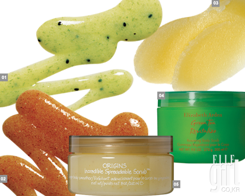 1 오색 황토 보디보디 스크럽 다이아몬드, 가격미정. 2 끌레드뽀 보떼 엑스폴리앙 두쐬르 뿌르 르꼬르, 7만원. 3 클라란스 토닉 보디 폴리셔, 비타민 스크럽. 5만2천원. 4 오리진스 인크레더블 스프레더블 진저보디 스무디, 4만원. 5 엘리자베스아덴 그린티 리바이탈라이즈 리뉴잉 보디 스크럽, 3만2천원. |