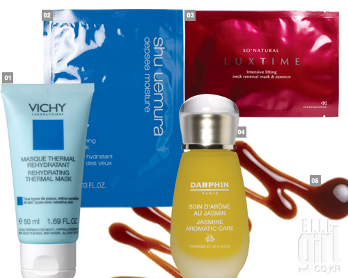 1 비쉬 리하이드레이팅 떼르말 마스크, 2만6천원. 2 슈에무라 딥씨 모이스춰 아이 마스크, 8매 5만2천원. 3 쏘 내추럴 럭스타임 넥 리뉴얼 마스크, 5매 3만8천원. 4 달팡 샤스민 아로마틱 케어. 농축 에센셜 오일, 14만7천원. 5 자인 생기 필 오프 팩, 한방 성분이 피부를 맑게 가꿔준다. 4만원. |
