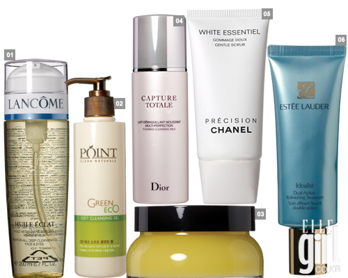 1 랑콤 휠 에끌라. 부드러운 오일 타입의 클렌저. 4만6천원. 2 포인트 그린 에코 소프트 클렌징 젤, 1만4천원대. 3 바비 브라운 엑스트라 밤 린스. 히팅 효과의 클렌저. 9만원. 4 크리스챤 디올 캡춰 토탈 멀티퍼펙션 포밍 클렌징 밀크. 물과 만나면 풍성한 거품이 생기는 독특한 밀크 타입. 8만원. 5 샤넬 화이트 에쌍씨엘 젠틀 스크럽. 마스크와 함께 사용하는 화이트닝 전용 홈 트리트먼트 프로그램. 18만원. 6 에스티 로더 아이디얼리스트 트리트먼트, 8만8천원. |