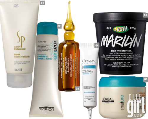1 웰라 SP 리페어 크림 30초. 손상모를 위한 마스크. 3만원대. 2 로레알 프로페셔널 파리 떼르다질 퓨리파잉 클레이. 클레이 성분이 두피를 딥 클렌징하는 헤어 마스크. 4만원대. 3 이브로쉐 피텀 액티브 1먼스 코스. 탈모 방지 앰플. 8만원대. 4 케라스타즈 컨센트레 비오-리차지, 5개, 7만원. 5 러쉬 마릴린. 민감한 두피를 진정시킨다. 2만7천9백원. 6 로레알 프로페셔널 파리 마스크 리쉬. 가격미정. |