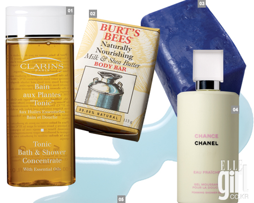 1 클라란스 토닉바스&샤워 컨센트레이드. 2만9천원. 2 버츠비 내추럴리 너리싱 밀크 쉐어버터 보디바, 1만3천원. 3 러쉬 파더 프로스트 보디바. 가격 미정. 4 상큼한 향의 샤넬 오 후레쉬 포밍 젤. 6만원. |