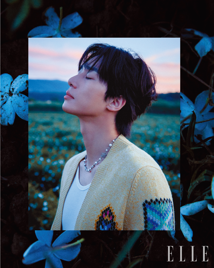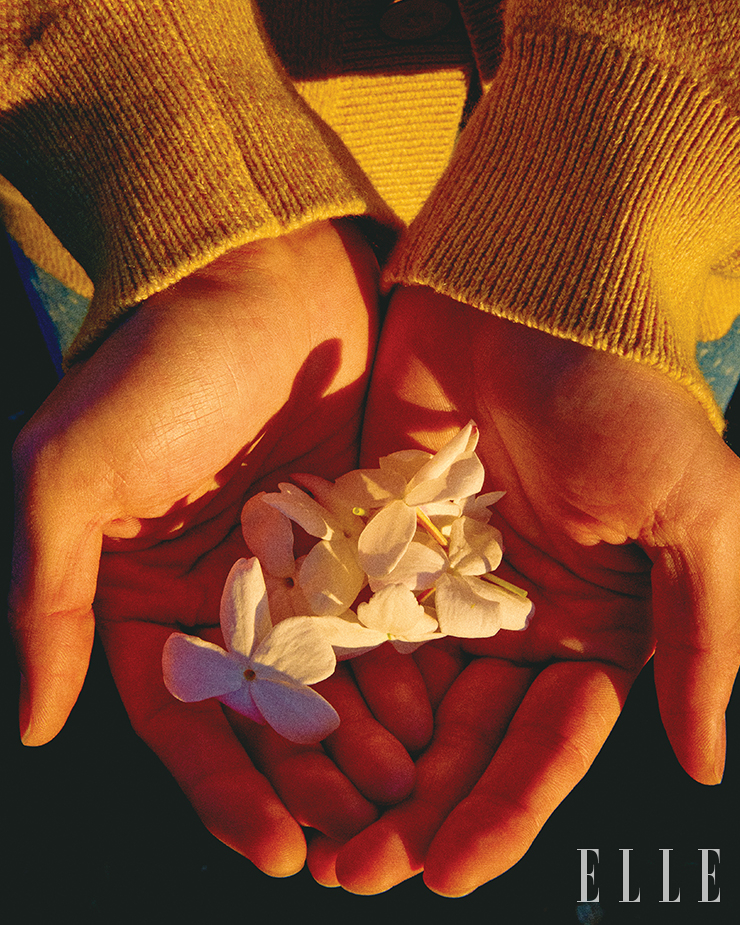 자수 디테일이 가미된 옐로 캐시미어 카디건은 Barrie. 더블 C 로고가 새겨진 데님 팬츠와 펄 네크리스는 모두 Chanel. 슬리브리스 티셔츠는 스타일리스트 소장품.