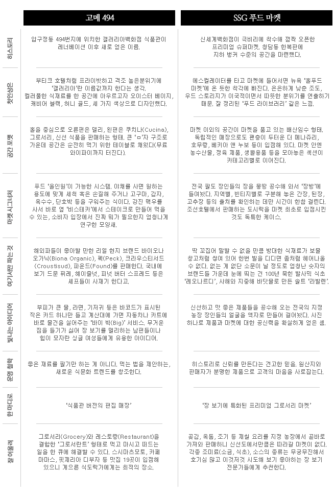 그로서리 마켓에 스타일리시(Stylish)란 형용사를 붙이면? 서울에선 이 두 가지 이름이 튀어나온다. 고메 494와 SSG 푸드 마켓. 대표적인 트렌디 푸드 마켓 꼼꼼 비교.