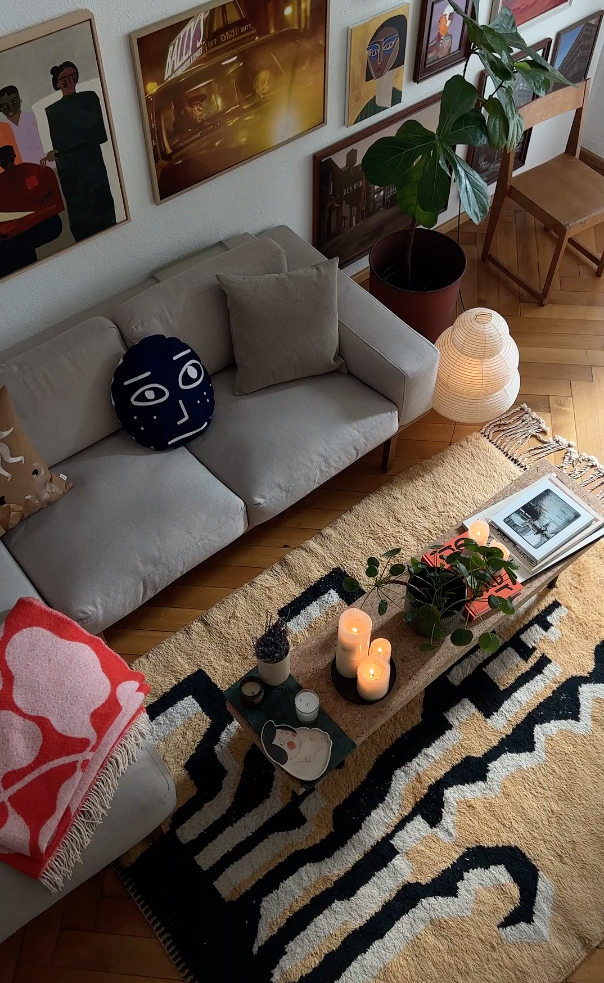 마음에 드는 작품을 골라 벽에 걸어보는 것부터 시작입니다. 어렵지 않아요. 좋아하는 오브제들을 선반 위에 모아두듯 그림들도 하나씩 걸어보는 거죠. SNS에서 이 질문을 많이 받아서 갤러리 월 마스터클래스라는 PDF 가이드도 만들었어요. 작품을 배치하기 좋은 스폿으로 현관문 반대편, 소파나 식탁 위, 낮은 수납장 위, 그리고 복도 모서리를 추천합니다. 시선이 자연스럽게 머무는 곳들이에요. 특히 복도에는 개성 있는 작품들을 걸어보세요. 지날 때마다 흥미진진한 아이디어들이 떠오를 거예요.