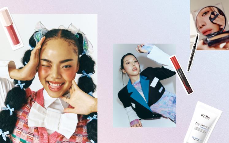 서울을 강타한 ‘탕후루’ 열풍이 메이크업에까지 이어졌다. 물기 어린 광택이 ‘촤르르’ 흐르는 입술은 Colorgram 탕후루 탱글 틴트, 방긋방토로 연출한 것. 입술과 질감의 대비를 주기 위해 피부는 본연의 톤만 맑게 정돈해 주는 Javin de Seoul 허깅 스킨 틴트를 발라 내추럴하게 표현했다.