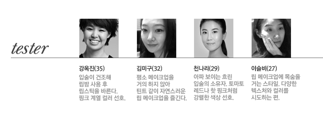 슬비 ★★★★ 매트한 질감 때문에 입술 각질에 끼지 않을까 걱정했는데 의외로 촉촉해 장시간 편안한 입술 상태를 유지할 수 있었다. 게다가 스머징 쿠션이 장착돼 있어 손으로 문지를 필요가 없는 것이 가장 큰 장점.