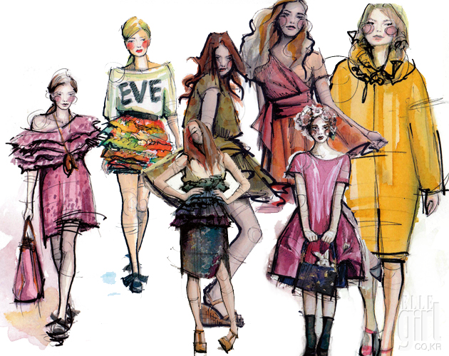 Q 패션 일러스트를 그리기 위해선 패션에 대한 이해가 필요하다. 이를 위해 특별히 노력하는 점은. A 디자인을 전공했고, 실제로 의류 디자인을 하고 있긴 하지만, 패션은 여전히 어렵고 공부할 게 많다. 특히 패션을 눈 으로 보고 느끼는 것에서 끝나는 것이 아니라, 그것을 나만의 스타일로 소화시킬 줄 알아야 멋진 일러스트를 그려낼 수 있는 법. 시시각각 변하는 패션 트렌드를 민첩하게 캐치하는 능력이 중요하다. 이를 위해 매일 다양한 종류의 패션 웹사이트, 디자이너 블로그에 접속하는 것은 물론이고, 컬렉션 북이나 패션잡지 등도 늘 곁에 두고 보는 편이다. 실제 로 내 블로그에는 각 패션 브랜드들이 쇼에서 선보였던 컬렉션 컷을 내 나름대로 스케치한 일러스트가 꽤 많은데, 이 를 통해 시즌별 트렌드나 코디네이션에 대해 많은 것을 배우게 된다.