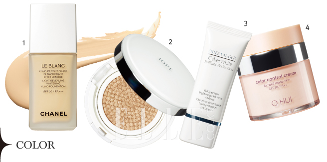 정샘물인스피레이션의 정샘물 원장은 붉은 기가 도는 따뜻한 느낌의 웜 톤 피부에는 그린의 쿨 톤 제품을, 혈관이 비쳐 보일 듯 투명하고 창백한 쿨 톤 피부에는 핑크색 웜 톤을 사용하라고 이야기한다. 반대되는 색을 바르면 피부 톤이 중화되면서 자연스러운 룩을 연출할 수 있기 때문. MAC의 NC(Natural Cool)와 NW(Natural Warm), 바비 브라운의 웜 포슬린(Warm Porcelain), 에스티 로더의 쿨 바닐라(Cool Vanilla)처럼 컬러 명을 확인하면 쿨 톤인지 웜 톤인지 확인할 수 있다. 자신의 피부가 웜 톤인지 쿨 톤인지 구분하기 어렵다면 너무 어둡거나 밝지 않은 색을 고르는 데 집중하도록. 여러 가지 제품을 턱 선에 묻혀 실눈을 뜨고 거울을 봤을 때 얼굴과 목 피부색에 가장 유사하게 어우러지는 컬러를 고르면 된다. 더욱 쉬운 방법이라면 컬러 캡슐들이 터지며 흰색 포뮬러가 베이지로 피부 톤에 맞게 변하는 CC(컬러 코렉팅)크림을 선택하는 것.