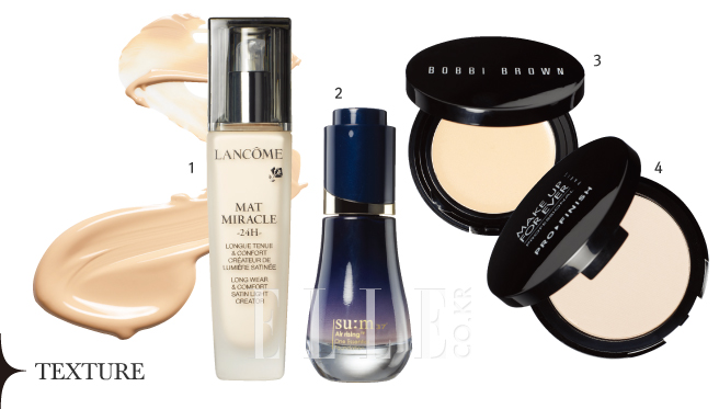 베이스 메이크업 제품 선택 시 가장 먼저 고려해야 할 것은 텍스처다. 텍스처는 피부 타입에 관여하는 요소로 메이크업이 들뜨거나 번들거리지 않도록 도와준다. 피부가 건조하면 촉촉한 포뮬러를, 오일리한 지성 피부는 매트한 포뮬러를 고르는 것이 기본. 촉촉한 제품에는 대개 미네랄이나 에센스 같은 보습 성분이 함유돼 있으며, 매트한 포뮬러는 과다 피지를 잡는 파우더가 들어 있거나 패키지에 오일 프리(Oil Free)라고 적혀 있다. 피부 타입을 파악했다면 1년 365일 같은 제품만 고집하기보다 서로 다른 포뮬러의 제품을 함께 구비해 두고 계절이나 TPO에 따라 골라 써보는 것도 좋다. 실내에 머무르거나 건조한 날에는 촉촉한 포뮬러를, 장시간의 야외 활동이 있거나 무더운 날에는 매트한 포뮬러를 사용하면 된다.