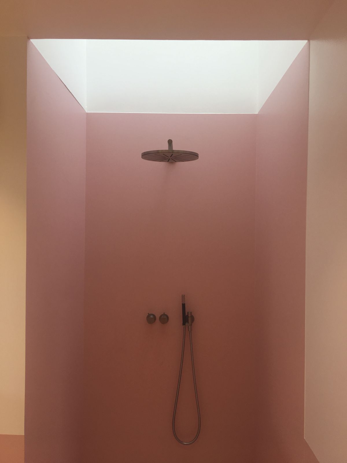 욕실 바닥과 벽은 폴리우레탄 PU 소재로 제작했어요. 물 위에 떠있어야 하는 집의 특성상 최대한 가벼운 소재로 마감해야 하기 때문이죠. 집 전체에서 유일하게 컬러풀한 공간이기 때문에 조금 더 색다른 재미를 주고 싶어 로사 컬러로 맞춤 제작했습니다.