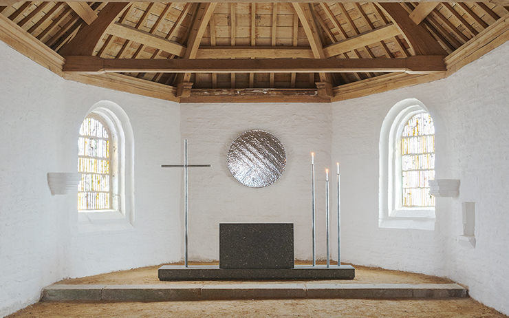 브르타뉴의 성당 프로젝트 내부에 사용된 유리 샘플을 거울처럼 놓았다. 거실에 놓인 로낭의 세라믹 베이스 ‘타지미(Tajimi)’, 갤러리 크레오에서 최근 그의 드로잉과 세라믹 베이스를 함께 전시했다.
