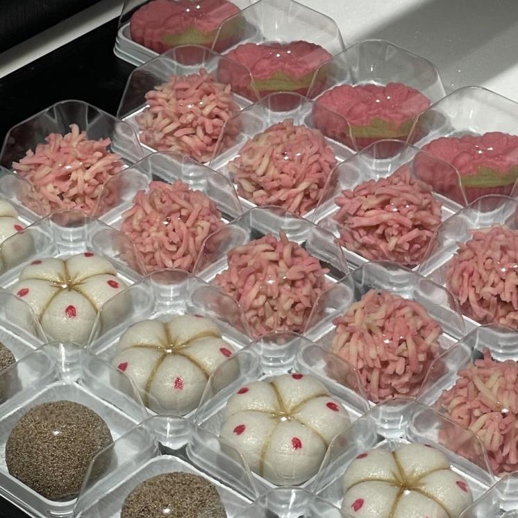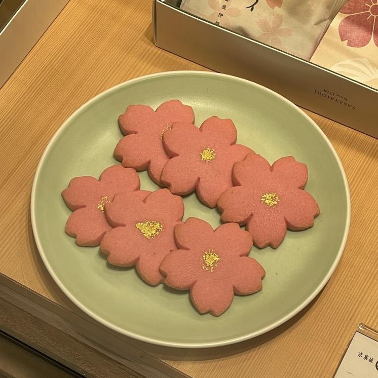 일본 전통 과자 전문점 ‘사사야이오리’에서는 연분홍 핑크 반죽의 사브레 쿠키 위에 금가루를 흩뿌려 벚꽃 쿠키를 완성했네요. 쿠키 하나의 사이즈가 꽤 커서 꽃잎을 하나씩 떼어가며 먹는 재미가 있습니다.