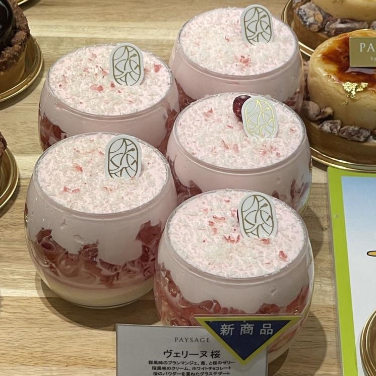 조각 케이크와 럭셔리 푸딩으로 유명한 ‘페이세이지’ 역시 보기 좋고 맛도 좋은 사쿠라 에디션을 개발했습니다. 아래에는 우유 푸딩을 깔고 딸기 과육을 잘게 썰어 올린 다음 부드러운 핑크 크림으로 위쪽을 가득 채우고 초콜릿 가루를 뿌렸죠. 한 입만 떠먹어도봄기운이 와락 밀려 들어온답니다.