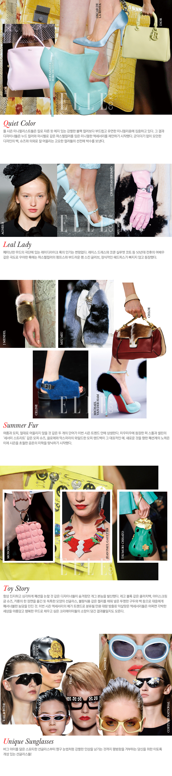 올 시즌을 대표하는 키 액세서리를 조목조목 따져 정리한 트렌드 관전 포인트! 낙천적이고 우아한 애티튜드가 묻어나는 2013년 S/S 액세서리 트렌드를 모두 모았다.