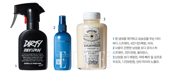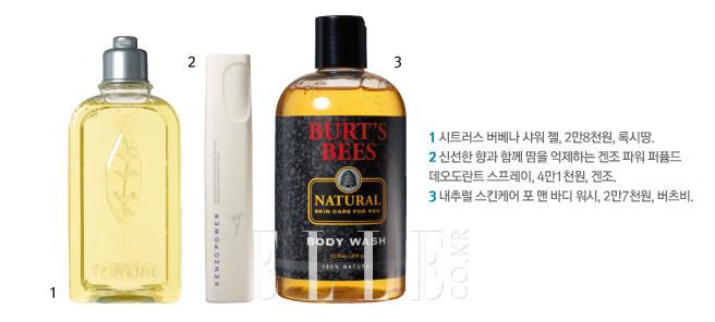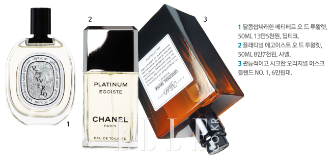과거 90년대 ‘쾌남’의 향기가 시원시원한 샤워 코롱, 스킨의 냄새였다면 요즘의 ‘훈남’ 향기는 조금 다르다. 강하지 않으면서도 여자로 하여금 궁금증을 일으키는 센슈얼한 향! “향이 은은하게 오랫동안 퍼지게 하려면 아침에 코롱(Cologne)이나 오 드 투왈렛(Eau de Toilette)으로 몸 전체를 감싸듯 뿌리세요. 그다음 진한 오 드 퍼퓸(Eau de Parfum)을 손목, 귀 뒤 같은 특정 부위에 조금씩 바르면 되죠.” 힐리, 에따 리브르 도랑주 등의 니치 향수 편집 숍 대표 김승훈의 조언. 향조는? “흙 냄새나 나무 향을 연상시키는 베티버가 메인 노트로 들어간 향수는 누구에게나 안전하죠.”