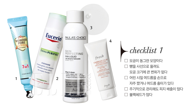 체크리스트에서 일치하는 항목이 3개 이상이라면 대개 사춘기에 성호르몬의 영향을 받기 시작해 어린 나이부터 모공이 넓어진 경우다(모공 하나 찾아볼 수 없는 아기 피부를 떠올려보길. 원래 모공은 현미경으로나 볼 수 있을 정도로 작다!). 성호르몬으로 피지 분비가 활발해지면서 피지가 모공 안쪽에 고이는데, 모공이 작아 스스로 빠져 나가지 못하고 쌓이면서 기둥처럼 굳어 모공을 넓히는 것. 일부는 오염물질을 만나 염증이나 여드름을 발생시키고 손으로 짜기 시작하면서 문제가 더욱 심각해진다. 이렇듯 눈에 보일 만큼 큼직해진 지성 모공을 케어하는 첫 번째 단계는 딥 클렌징이다. 모공 속 피지와 노폐물을 깨끗이 청소해 모공이 조여들 수 있는 공간을 확보해야 하기 때문. 그 다음은 모공 수렴 효과가 있는 ‘아스트린젠트(Astringent)’ 토너를 화장솜에 충분히 적셔 얼굴에 올려볼 것. 이것만으로도 모공이 순간적으로 수축되는 느낌을 받을 수 있다. ‘살리실산(Salicylic acid)’이나 ‘바하(BHA)’ 성분이 함유된 토너로 신경 쓰이는 부위의 각질을 부드럽게 닦아내는 것도 좋다. 트러블이 심하면 모공을 막지 않는 ‘논코메도제닉(noncomedogenic)’이나 ‘오일 프리’ 타입의 스킨케어 제품을 사용한다.