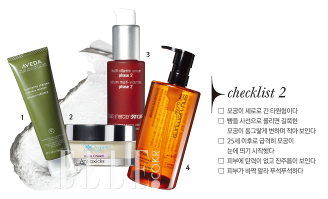 학창 시절 피지나 여드름으로 크게 고민하진 않았지만 나이가 들면서 모공이 눈에 띄기 시작했다면 일명 ‘세로 모공’이라 부르는 노화 모공을 의심해 볼 것. 피부는 주로 25세를 전후로 늙기 시작하며 이때부터 탄력 기능이 서서히 저하된다. 진피 속 콜라겐이나 엘라스틴의 양이 줄어들면서 피부는 점차 얇아지고 탄력도 잃게 되는 것. 모공의 탄력 역시 약화되면서 모공이 중력 방향으로 힘없이 늘어지고 깊이가 깊어질수록 흉터처럼 보이기도 한다. 리더스피부과 압구정점 윤성재 원장은 “노화가 원인인 경우 피지량의 많고 적음은 사람에 따라 차이가 있을 수 있지만 건성이든 지성이든 모공의 탄력을 증진시키는 리프팅 제품을 함께 사용해야 합니다”라고 조언한다. 건성 피부라면 클렌징 오일로 피지를 녹여내고, 지성 피부라면 앞서 말한 ‘오일 프리’ 클렌저로 모공 속 노폐물을 제거하는 것이 우선. 스킨케어 단계에서는 콜라겐의 합성을 돕는 비타민 A의 한 형태인 ‘레티놀(retinol)’이나 항산화 작용으로 노화를 방지하는 ‘비타민 C’가 함유된 제품으로 모공의 지지력을 향상시키는 것이 중요하다. 민감성 피부라면 피부 자극이 될 수 있는 각질제거제나 알코올 성분은 피하고 피부 진정은 물론 보습, 리프팅까지 케어하는 더마 코스메틱 제품을 추천한다.