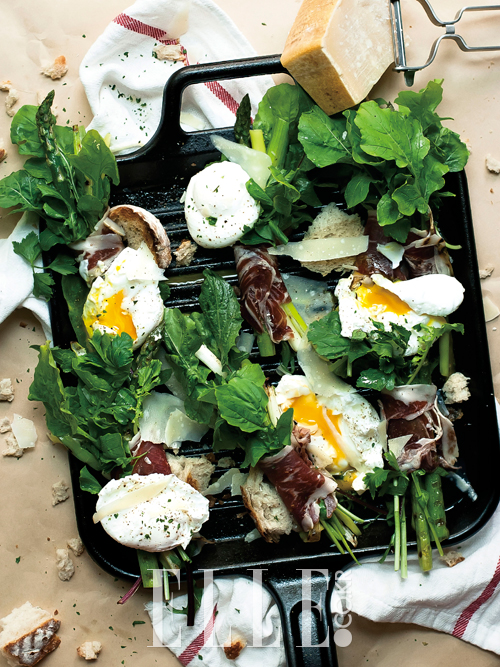 전형적인 미국식 브런치 재료인 베이컨, 달걀, 빵이 무겁게 느껴지는 아침엔 ‘야채’로 무거움을 덜어내는 수밖에 없다. 채소들을 다 섞어 한 접시에 내놓기보다 재료들을 늘어놓은 채 빵과 치즈를 양껏 덜어 먹는 쌈이나 타코처럼 가볍게 싸먹으면 된다.