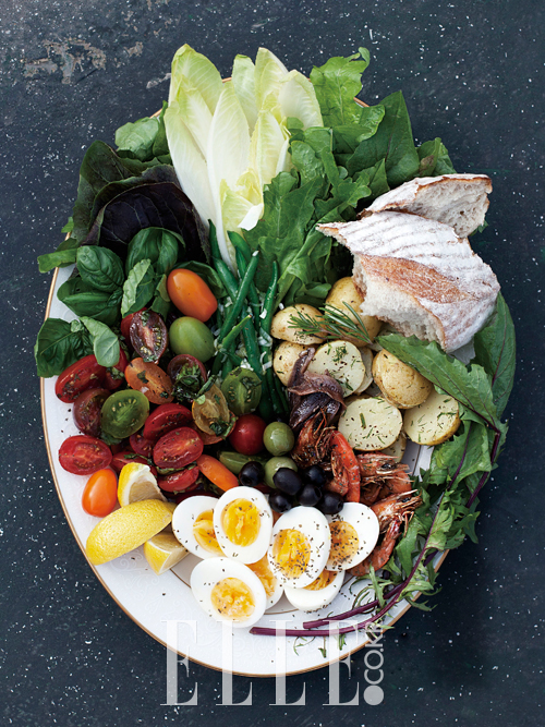 너무나 더웠던 지난여름을 잠시 잊고 있었는데 또다시 그 무서운 녀석이 찾아왔다. 불 앞에서 요리하면서 시간 보낼 일이 막막해 궁리 끝에 생각해 낸 샐러드. 식사로도 모자람 없는 샐러드는 친구 여럿이 갑자기 들이닥쳤을 때 내놓기 훌륭한 메뉴다. 감자와 달걀을 곁들여 속이 제법 든든한 것. 원래의 ‘니스와즈(Nicoise)’ 샐러드(프랑스 니스 지방에서 유래했다. 올리브, 엔초비, 케이퍼를 더한 것으로 영양 밸런스가 뛰어난 샐러드)는 재료와 드레싱을 각각 따로 담아내는데 나는 향이 다른 허브에 재료를 각각 버무려 준비했다.