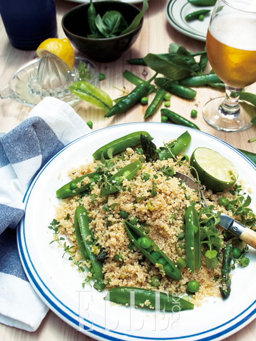 어릴 적 프랑스에서 살 때, 우리 가족에게 ‘꾸스꾸스(Couscous 거친 밀가루를 물과 쪄서 부풀린 것. 모로코 전통 음식으로 양고기, 닭고기를 얹어 덮밥처럼 먹기도 한다)’는 꼭 볶은 쌀밥 같아서 즐겨 먹었던 추억의 음식. 작은 좁쌀 같이 생긴 꾸스꾸스는 파스타처럼 이미 가공된 ‘듀럼 밀(Durum Wheat 마카로니 밀로도 불린다. 지중해 연안, 터키, 러시아 등지에서 재배)’로 따뜻한 물을 붓기만 하면 바로 먹을 수 있어 조리 방식이 쉽다. 봄에 나오는 완두콩과 아스파라거스를 이용한 샐러드로 닭 오븐구이에 곁들이는 샐러드로 만들어 먹곤 한다.
