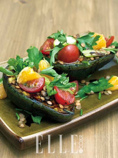‘아보카도’를 재료로 한 요리는 ‘과카몰리’밖에 모르던 때, 멕시코를 여행하다 아보카도의 다양한 쓰임새를 목격하게 됐다. 아보카도는 다른 식재료와 만났을 때 식감을 부드럽게 만들어주지만 동시에 기름기가 많아서 상큼한 채소와 곁들여 먹는 편이 한층 더 낫다. 속살을 곱게 빚어 샐러드에 넣을 때가 많지만 이번엔 반을 자른 아보카도를 그릴에 구워 샐러드 ‘베이스’로 사용해 봤다.
