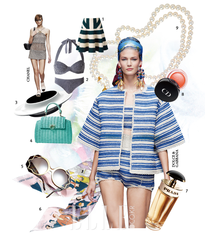 생 트로페와 니스, 칸을 잇는 지중해 연안의 리비에라. 초록을 띤 아주르 블루(Azure Blue)빛 해변은 F. 스콧 피츠제럴드와 피카소, 그레이스 켈리, 브리짓 바르도 등 세기적 작가와 예술가, 배우들이 꿈같은 휴가를 보낸 곳이다. 영화 <나는 결백하다>의 그레이스 켈리와 <슬픔이여 안녕>의 진 세버그, <리플리>의 기네스 팰트로를 떠올려보라. 50년대와 90년대의 낭만이 담긴 스타일 무비는 이번 시즌, 돌체 앤 가바나와 샤넬의 런웨이로 옮겨졌다. 버티컬 스트라이프 톱과 카프리 팬츠, 허리춤에 느슨히 묶은 셔츠와 풀 스커트, 에스파드리유, 캐츠 아이 선글라스와 바스켓 백은 이번 여름, 여자들의 휴가지를 리비에라의 낭만으로 이끌어줄 것이다. 설령 그곳이 생 트로페와 칸이 아닌들 어떠하리.