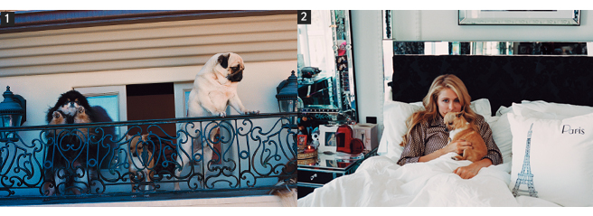 1 힐튼의 사랑스러운 ‘아이’들 중 하나. 목에 걸고 있는 플래티넘 다이아몬드 브레이슬릿은 가격 미정, Harry Winston.