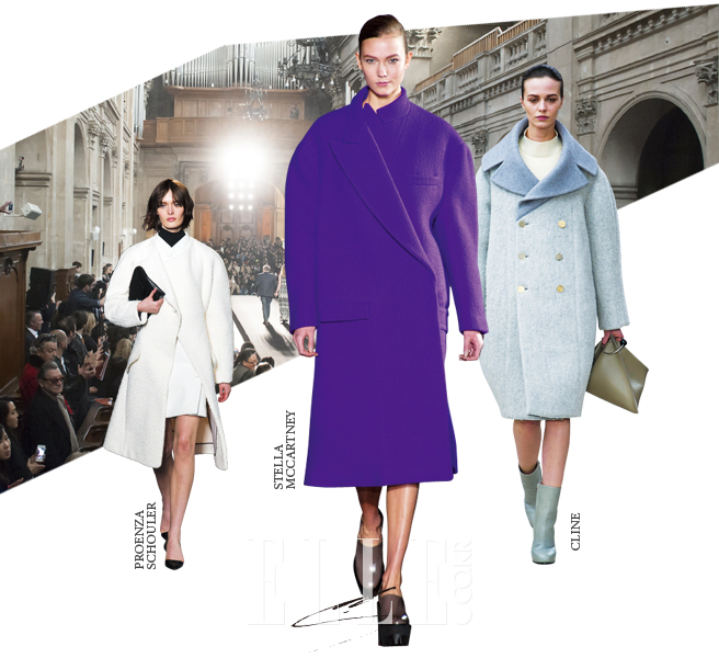 럭비 선수가 입을 법한 커다란 어깨 라인과 아래로 내려올수록 좁아지는 실루엣의 코쿤 코트가 이번 겨울 머스트 해브 아이템으로 자리 잡을 전망이다. 둥글게 굴린 어깨 라인을 포인트로 오버사이즈의 위용을 자랑하는 이 코트는 어깨선이 많이 내려올수록, 컬러는 파스텔 톤일수록 좋다. 프로엔자 스쿨러의 모델들처럼 어깨 아래 사각 클러치백을 들어 연출하는 것도 코쿤 코트를 스타일리시하게 소화하는 방법이다.
