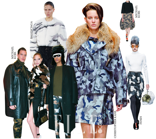국내에서도 군대 이야기를 다룬 프로그램들이 큰 인기몰이를 하는 와중에 2013 F/W 런웨이 위에도 카무플라주 패턴의 활약이 돋보인다. 발렌시아가에서 첫 컬렉션을 선보인 알렉산더 왕과 마이클 코어스는 카무플라주 패턴의 퍼 재킷을 선보였으며 펜디는 프린지로, 크리스토퍼 케인은 패치워크를 통해 각자 개성 있는 밀리터리 룩을 완성했다.