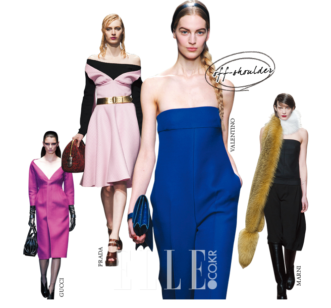 이번 시즌 가장 ‘핫’한 보디 이슈는 바로 어깨. 머리부터 발끝까지 꽁꽁 싸매도 모자랄 추위 앞에서 포기할 수 없는 어깨 노출은 멀쩡한 옷도 내려 입고 싶게 만드는 프라다와 절묘하게 어깨 라인에 걸친 구찌 등을 내세우며 쇄골 미인들의 열렬한 지지를 받고 있다. 정 추위를 못 견딜 것 같다면 마르니 레이디처럼 퍼 스카프를 둘러 글래머러스하게 연출하는 것도 팁.