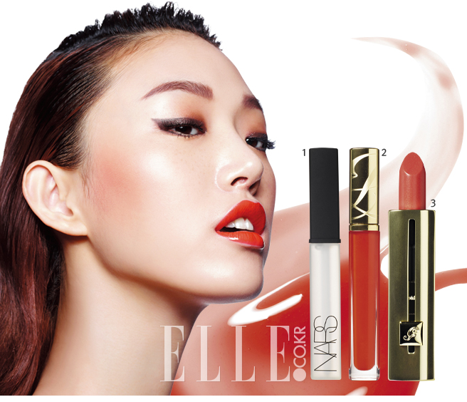 글래머러스하고 시크한 매력으로 어필하려면 강렬한 오렌지 컬러를 입술에 듬뿍 머금어 보는 건 어떨는지. 청량한 색상으로 경쾌하게 연출하면 오렌지 특유의 대담한 에너지를 한껏 발산할 수 있다. 먼저 다양한 오렌지 립스틱 중 명도와 채도가 높아 한눈에 들어오는 컬러를 고를 것. 색상 그대로 입술에 심플하게 채우되 브러시를 이용해 정교하고 또렷한 입술 라인을 그려야 깔끔하다(각이 지지 않도록 입술 산을 둥글게 만드는 것이 포인트!). 여기에 립글로스를 덧발라 젤리가 녹아든 듯 촉촉하게 마무리하면 입술이 더욱 도톰하고 드라마틱해 보인다. 메이크업 아티스트 류현정은 “발색이 뛰어난 립스틱 위에 펄 없이 투명한 립글로스를 덧바르세요. 화보 속 모델의 입술이 그러하듯 셀로판처럼 매끈한 입술을 완성할 수 있어요”라고 조언한다.