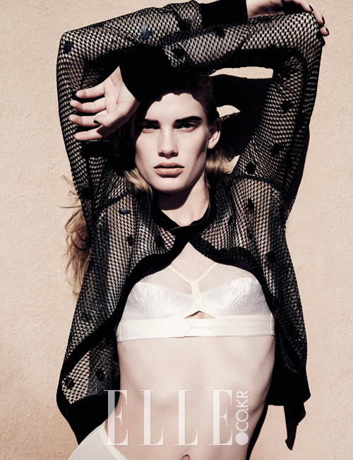 자카드 카디건은 Bottega Veneta. 사틴 브라와 브리프스는 What Katie Did.