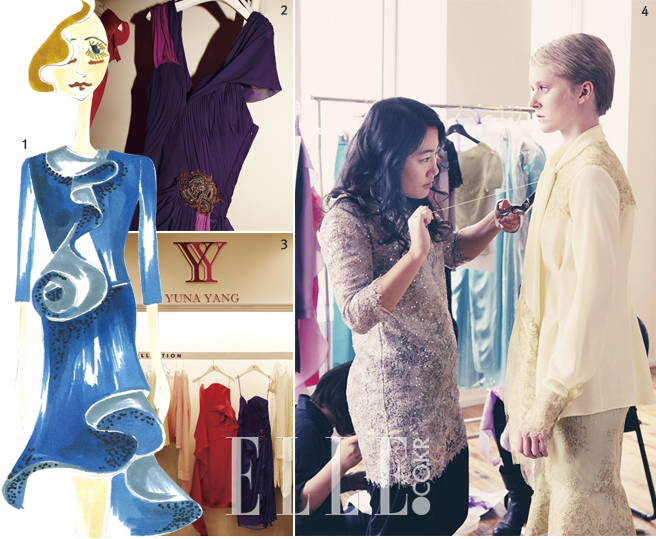 4 스튜디오에서 2012 S/S 컬렉션의 연둣빛 레이스 블라우스를 피팅 중인 양유나.