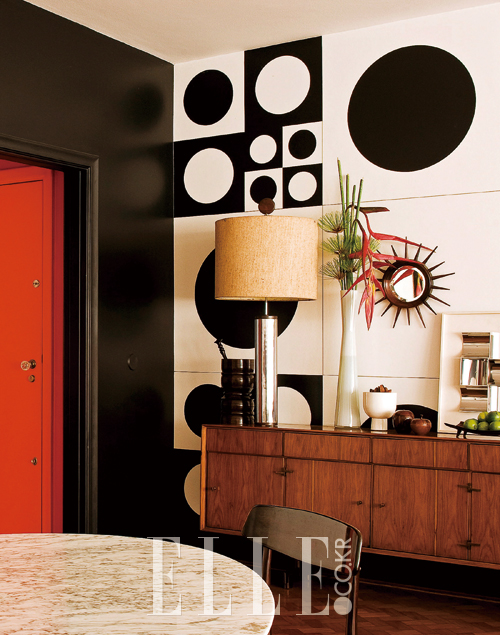 60년대 빈티지 모던풍 거실에 상큼한 컬러 터치를 가한 이곳은 유명한 아트 컬렉터이자 건축가인 로랑 크루아상도(Laurent Croissandeau)가 소유한 브라질 리우데자네이루의 작은 아파트. 모던한 가구의 조합이 고급스런 이 방에 활력을 더한 건 블랙 & 오렌지 컬러 터치다. 실내에 페인트를 칠할 땐 전체 분위기를 고려한 컬러 선택이 몹시 중요하다. 모던한 가구가 놓인 곳일수록 이왕이면 강렬한 색을 추천하는데 빈티지 오렌지 컬러 정도라면 후회없을 듯.