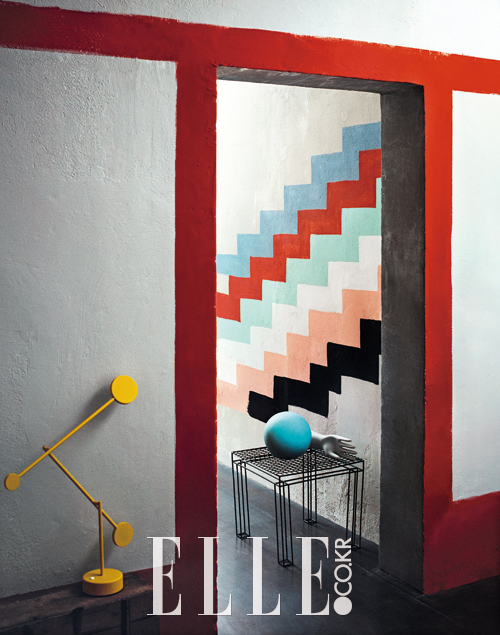 북아메리카 인디언 나바호(Navajo) 족의 예술과 남아프리카공화국의 은데벨레(Ndebele) 족의 벽화 사이를 오가는 에스닉한 매력. 컨셉트는 거창했지만 사실 이 문의 가장 큰 장점은 열지도, 닫지도 않아도 된다는 점. 좁은 공간을 확장하고 싶거나 두 방을 통일성 있게 연결하고 싶다면 기존의 문을 떼어내고 페인팅 만으로 인도어에 변화를 줄 수 있다. 기하학적인 무늬와 다채로운 색을 조합한다면 삭막한 통로에 활력을 더할 게 분명하다.