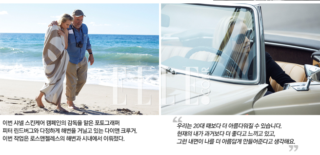 다이앤 크루거 주연에 피터 린드버그 감독. 둘의 이름만 들어도 감각적이고 예술적인 영상이 기대되는 촬영 현장의 모습들이다. 이 비하인드 컷은 다름아닌 샤넬 스킨케어 캠페인의 스케치. “피터와는 오랫동안 알고 지낸 사이죠. 그는 감정을 담아내고 자신의 피사체인 여성들의 단점까지도 아름답게 만들어주는 능력을 지녔어요. 그의 인물 사진은 깊이가 느껴지는 흔치 않은 아름다운 작품이며, 진정성을 가지고 있습니다. 우리는 로스앤젤레스에서 멋진 한 주를 보냈어요.” 다이앤 크루거의 회상이다. 그렇게 완성된 영상 속에는 LA 도심과 해변의 천국 같은 자연 그리고 마치 태초의 미녀인 양 순수하고 우아한 다이앤의 모습이 담겨 있다. 그녀의 도회적이고 세련된 분위기와 예술적 감성에 매료돼 모델로 선택했다는 게 샤넬 측의 귀띔.