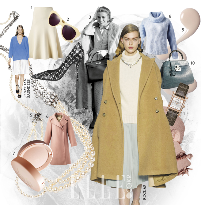 스크린 안팎에서 그레이스 켈리가 보여준 패션 스타일은 우아함의 정수였다. 특히 영화 <나는 결백하다 To catch a thief>와 <이창 Rear Window>에서 코스튬 디자이너 에디스 헤드(Edith Head)가 그녀를 위해 디자인한 클래식 룩은 디자이너들에게 끊임없이 영감을 불어넣는 유산으로 남았다. 이 모던 프린세스의 시그너처 아이템인 서클 스커트와 A라인 코트, 클래식 톱 핸들 백, 진주 목걸이와 올리버 골드스미스의 빅 캐츠 아이 선글라스는 예외 없이 매 시즌 리바이벌되는 클래식으로 자리 잡았는데, 뉴 시즌엔 좀 더 간결하고 모던한 빅 실루엣으로 변화한 점이 눈에 띈다. 카르벵과 로샤스의 오버사이즈 A라인 코트와 조너선 선더스의 파스텔 모헤어 스웨터, 셀린의 클린한 A라인 스커트는 익숙한 레이디 룩을 모던하게 모색할 수 있는 좋은 예다.