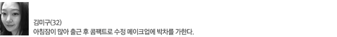 커버력이 월등한 로라 메르시에 스무스 피니쉬 파운데이션 파우더는 화장한 티가 나 프로페셔널한 인상을 남기고픈 날에는 적격. 샤넬 비타뤼미에르 컴팩트 두쉐르는 다소 건조해 브러시로 양을 조절하며 번들거림을 잡는 용도로 쓰기 좋다. 에뛰드 하우스 진주알 맑은 애니 쿠션은? 타깃 연령층이 낮아 지나치게 ‘뽀샤시’하지 않을까 걱정했지만 오히려 아이오페나 헤라보다 내추럴하게 마무리됐다. 피부는 건조하나 지나친 ‘물광’이 부담스러운 이들에게 추천.