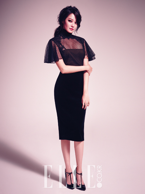 레이스와 벨벳 소재가 어우러진 드레스와 T 스트랩 슈즈는 모두 Gucci.